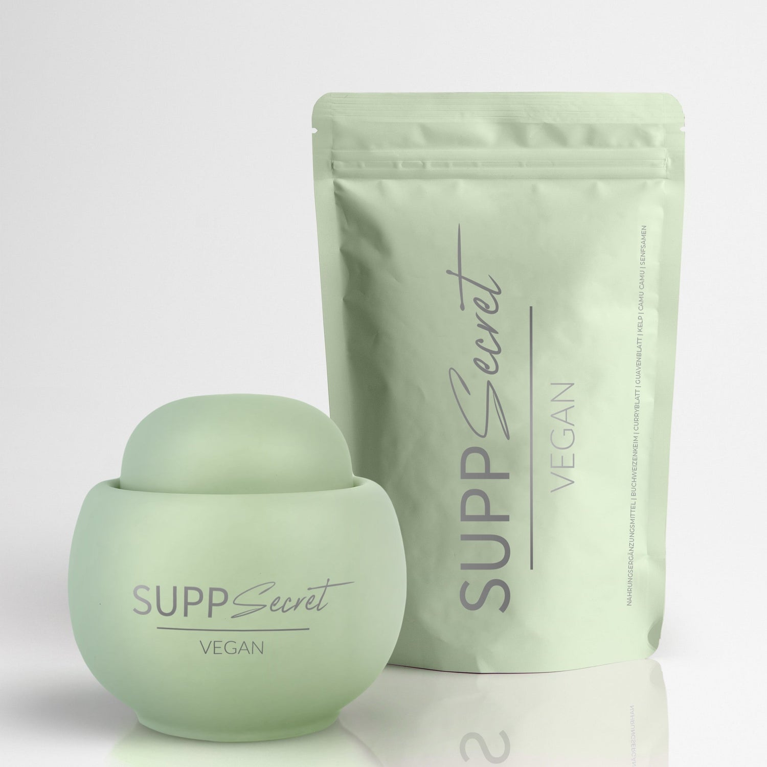 Neu hier? Unser Starterkit ist die perfekte Möglichkeit um einzusteigen! Enthalten ist ein hochwertiges Designerglas, in dem du deine Kapseln aufbewahren kannst und ein Refiller mit insgesamt 60 Suppsecret®-Kapseln, die deinen Bedarf für 30 Tage decken.